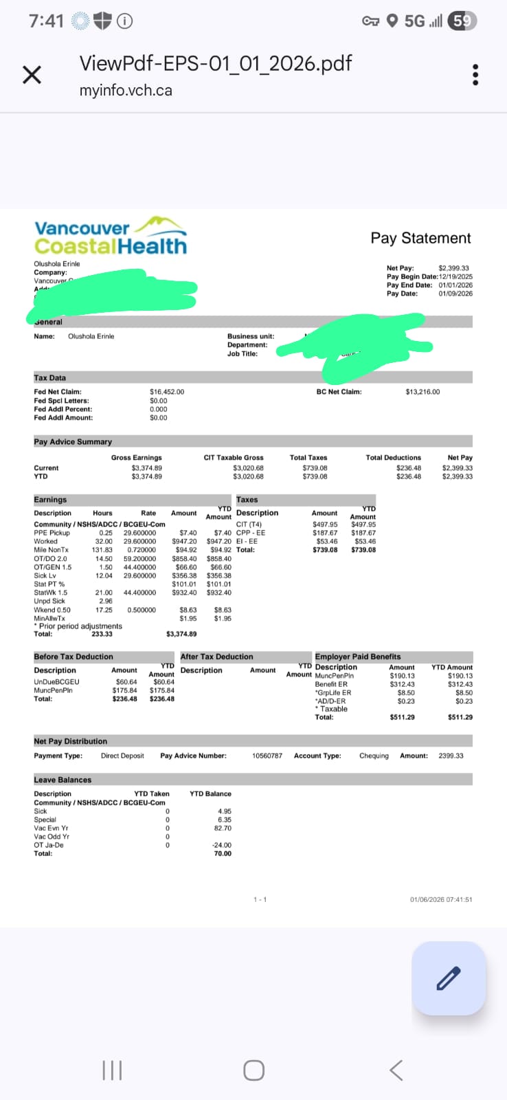 “My 2 weeks paycheck. Check what goes out in taxes as a Community Health Worker. I decided to share because every corner of Canada we are highly taxed. Nightmare. I have worked like this for 11 years.”